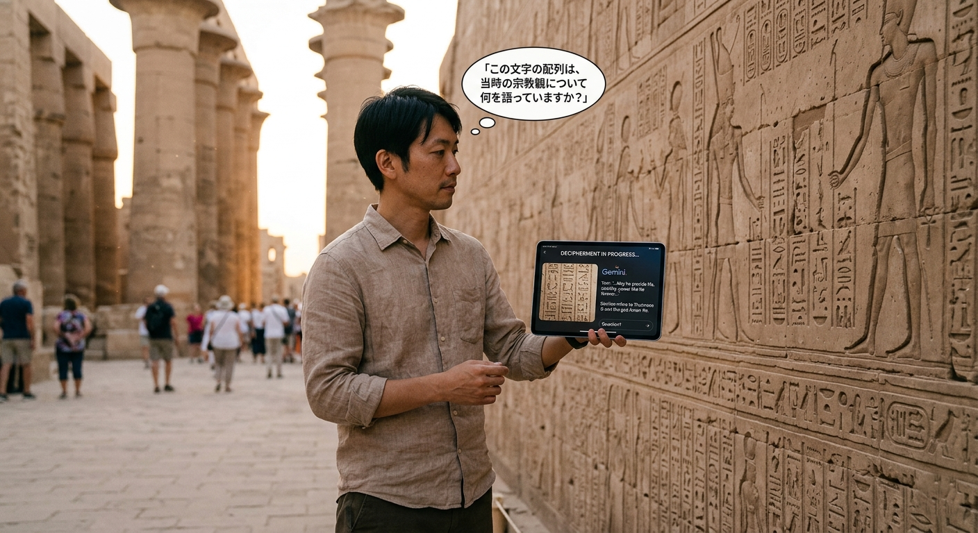 この質問から始まり延々と4時間にわたって、Geminiとの会話が続きます。時には出典を問いただし、仮説で問いかけ、さまざまな方法で対話を続けてGeminiからの知識を引き出しました。先に紹介したヒエログリフを後世のローマ帝国がエジプトの統治にどのように利用したかといった問いかけも行い、対話が続いたのです。